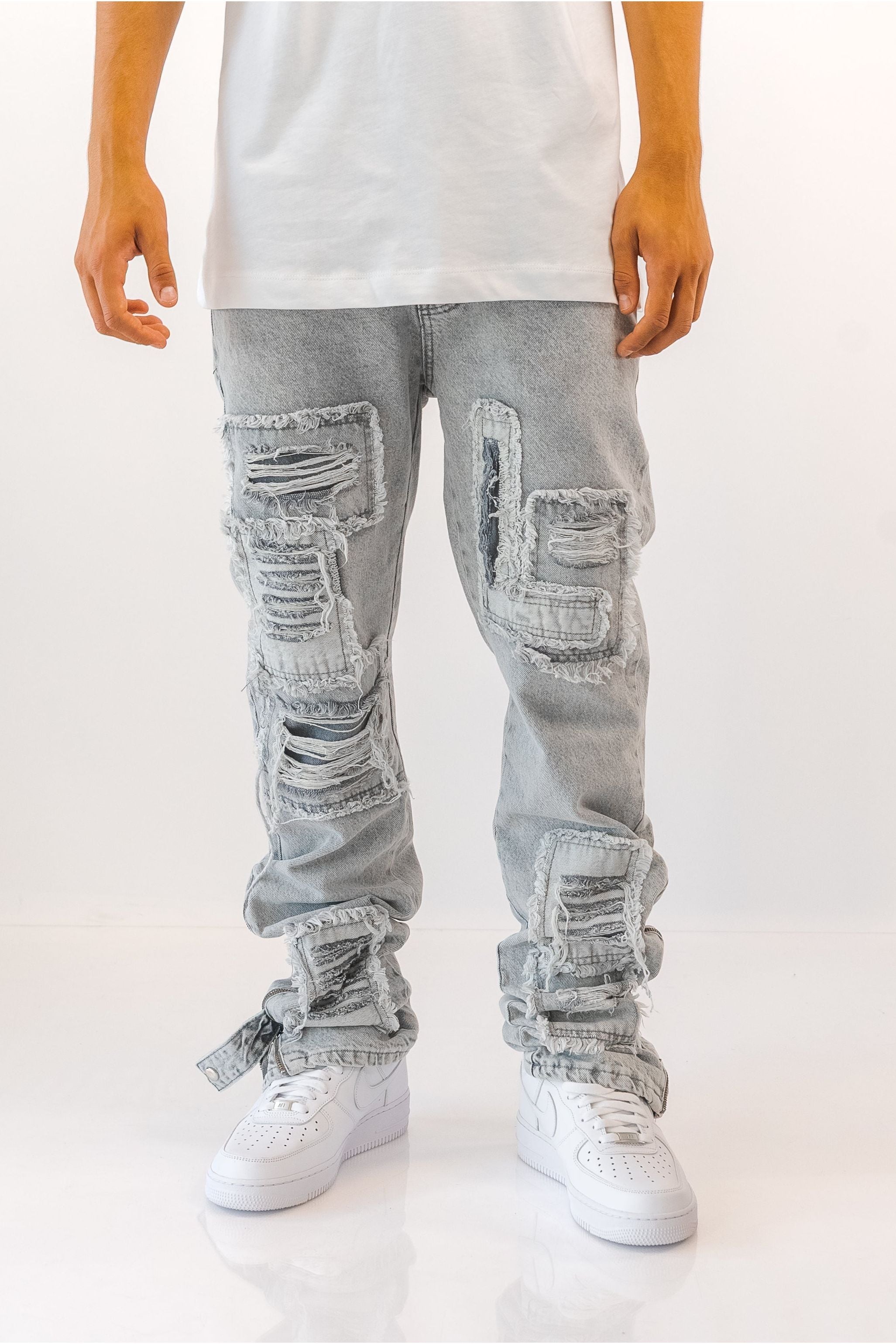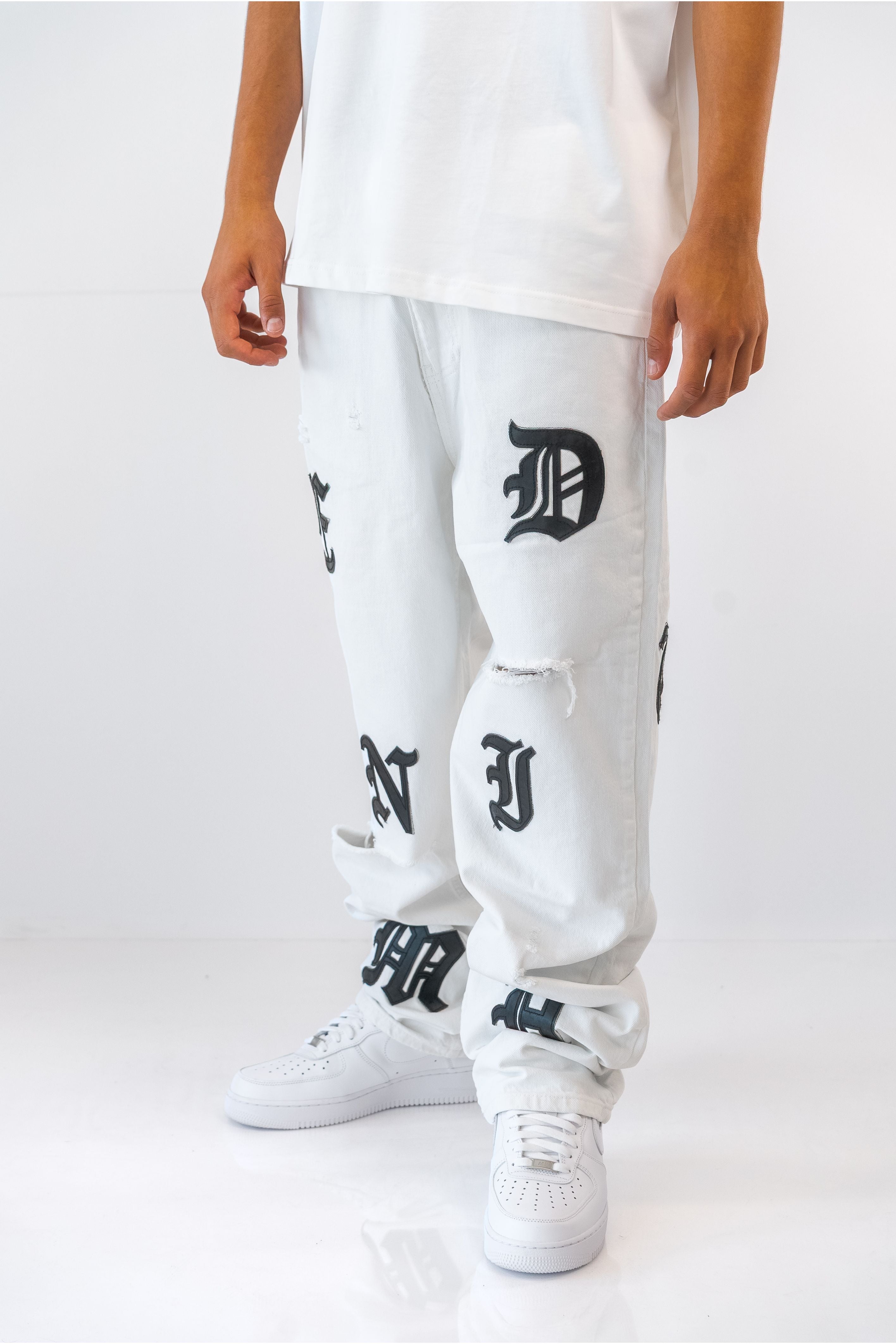 ג'ינס בגזרת Baggy בשילוב פאצ'ים לבן