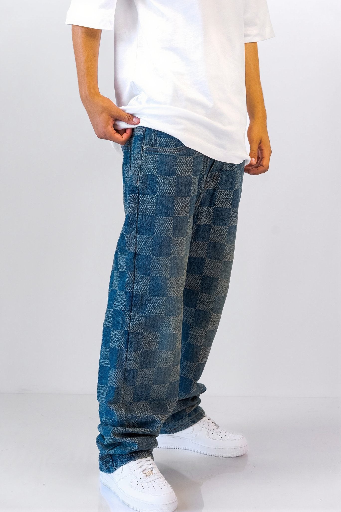 ג'ינס בגזרת Baggy בעיצוב ריבועים כחול