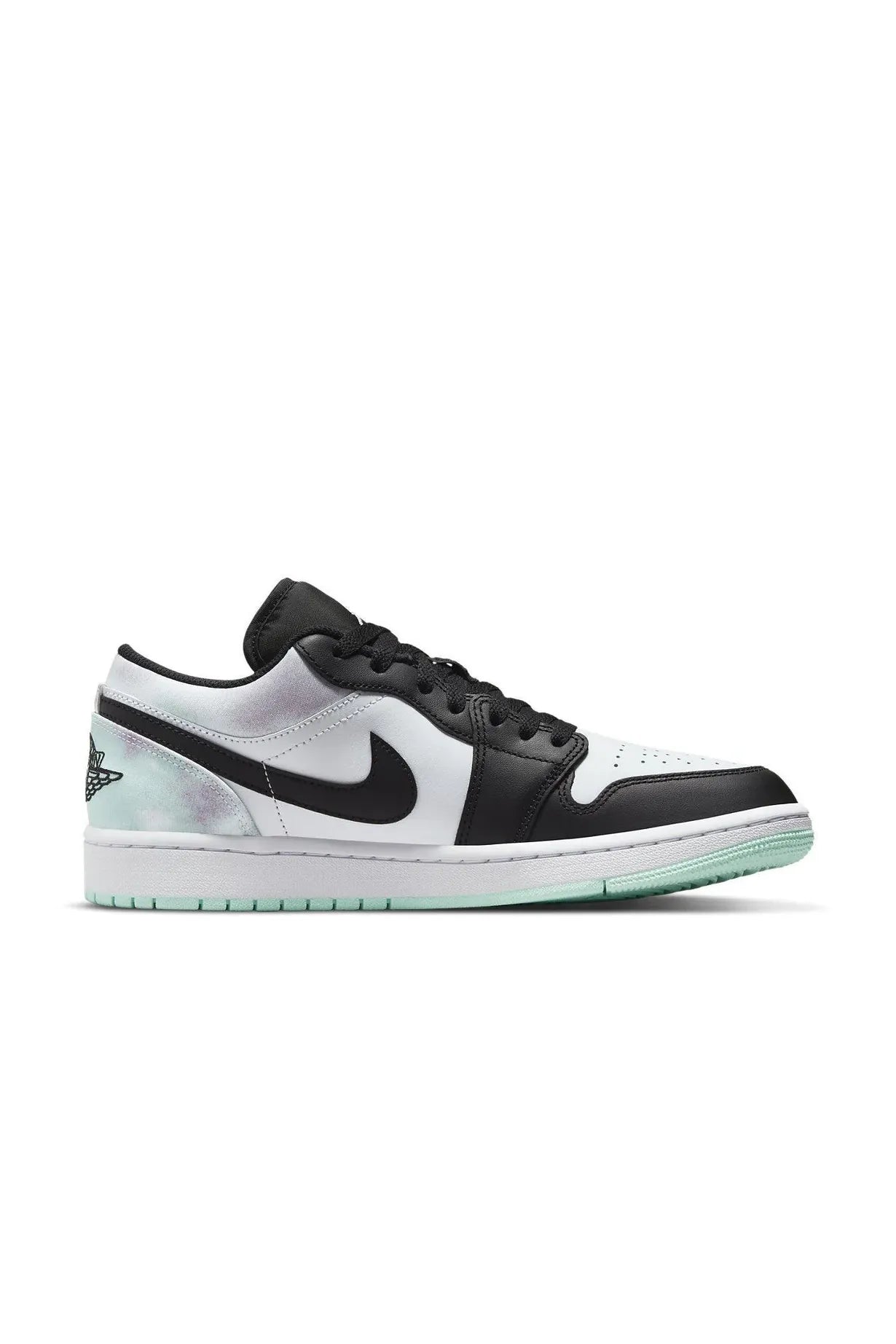 Featuring an all-leather design, the Air Jordan 1 Low SE Tie-Dye arrives with a White base and Black overlays on the toes, eyelets and Nike Swoosh logo. In the back, tie-dye pops of mint, pink and purple update the design, creating a standout look that sets the tone for the season. This shoe strikes a balance between comfort and style with a perforated toe and Air-fitted outsole for maximum comfort on and off the court. To top it off, signature Jordan Wings branding has been added to the heel counter, making the Air Jordan 1 Low SE Tie Dye instantly recognizable from every angle.