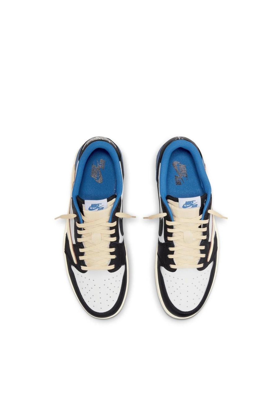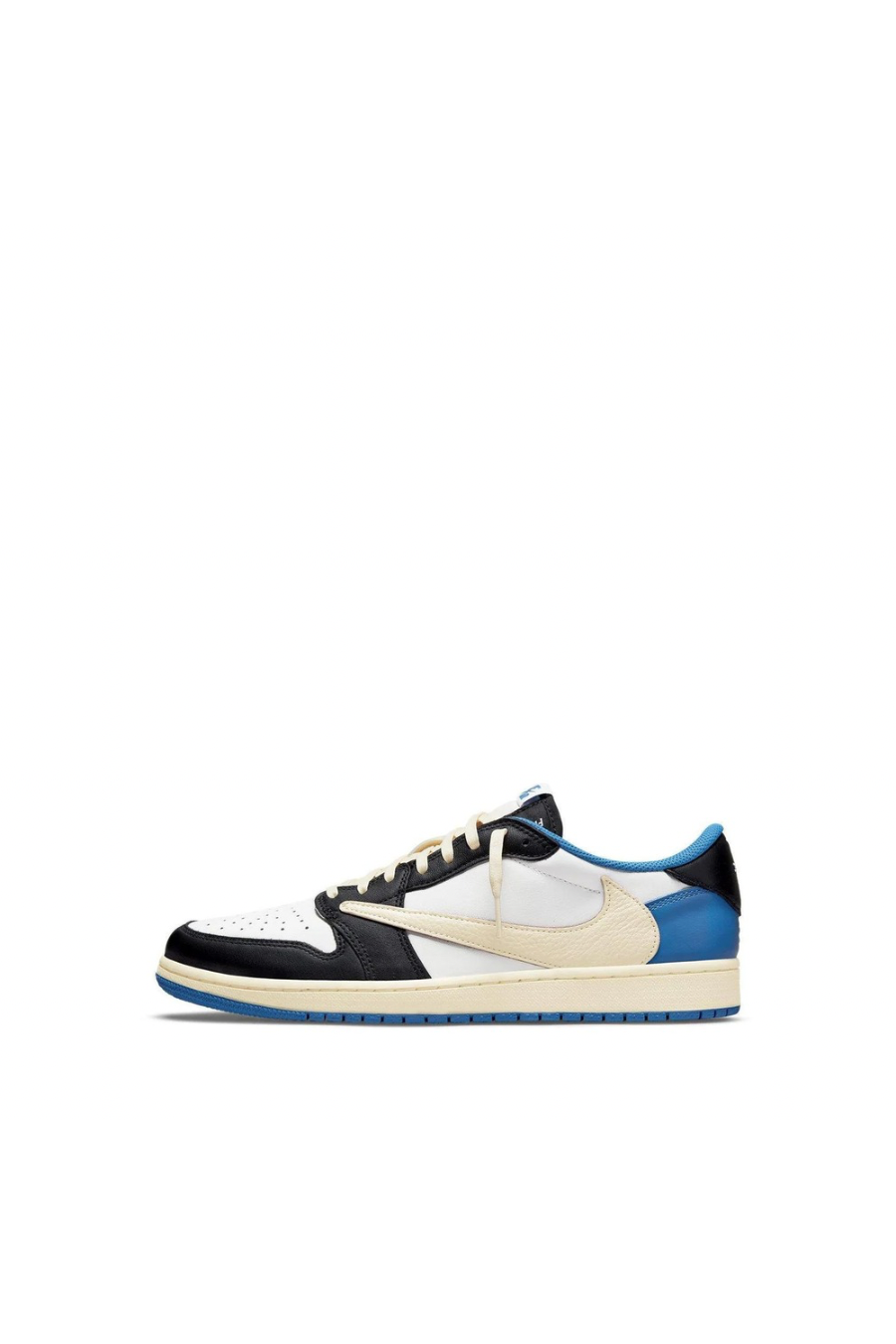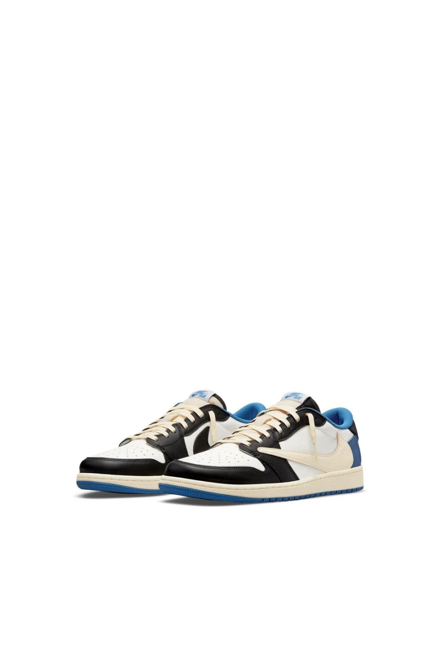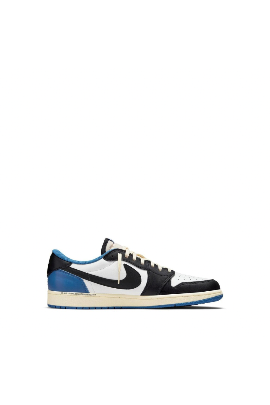 The Fragment Design x Travis Scott x Air Jordan 1 Retro Low is a collaborative effort that incorporates signature elements from both La Flame and Hiroshi Fujiwara's influential label. The colour scheme is reminiscent of previous Fragment collaborations, with a white leather upper and black and royal blue contrasting overlays. In an off-white finish, Scott's inverted and enlarged Swoosh is sewn on the lateral side panel, while a conventional black Swoosh is stitched on the opposite side. The rapper's happy face emblem is stamped directly beneath the Cactus Jack trademark on the left shoe's heel tab.