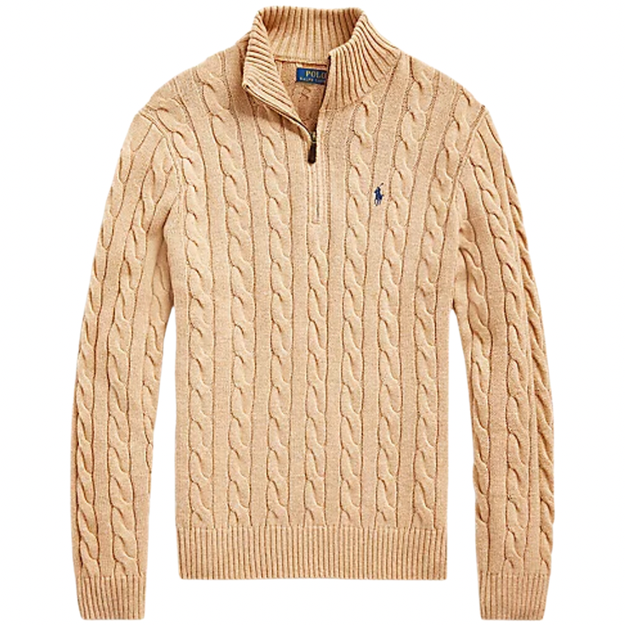 - Rib-knit mockneck. Quarter-zip placket with a suede zipper pull.